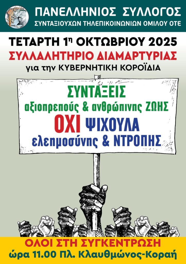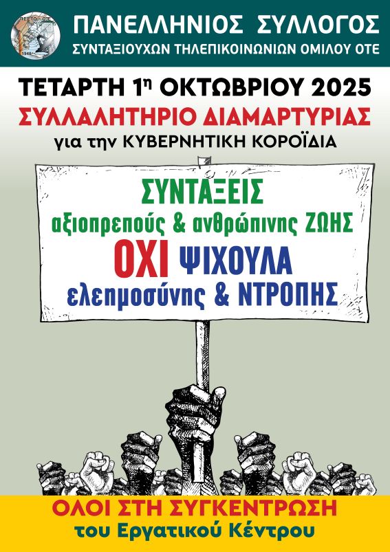Την ΤΕΤΑΡΤΗ 1Η Οκτωβρίου πραγματοποιούμε ΣΥΛΛΑΛΗΤΗΡΙΟ ΔΙΑΜΑΡΤΥΡΙΑΣ με συμμετοχή των Συνταξιούχων στις Συγκεντρώσεις των Εργατικών Κέντρων και στην Αθήνα στην Πλατεία Κλαυθμώνος (Κοραή) ώρα 11:00.