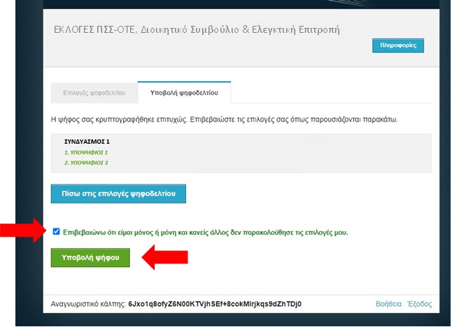 Αφού επιβεβαιώσετε τις επιλογές σας, μπορείτε να υποβάλετε την ψήφο σας επιλέγοντας «Υποβολή ψήφου» και αφού πρώτα δηλώσετε ότι τη στιγμή της υποβολής «είσαστε μόνος/-η στο τερματικό σας και κανείς άλλος δεν έχει παρακολουθήσει τις επιλογές σας».
