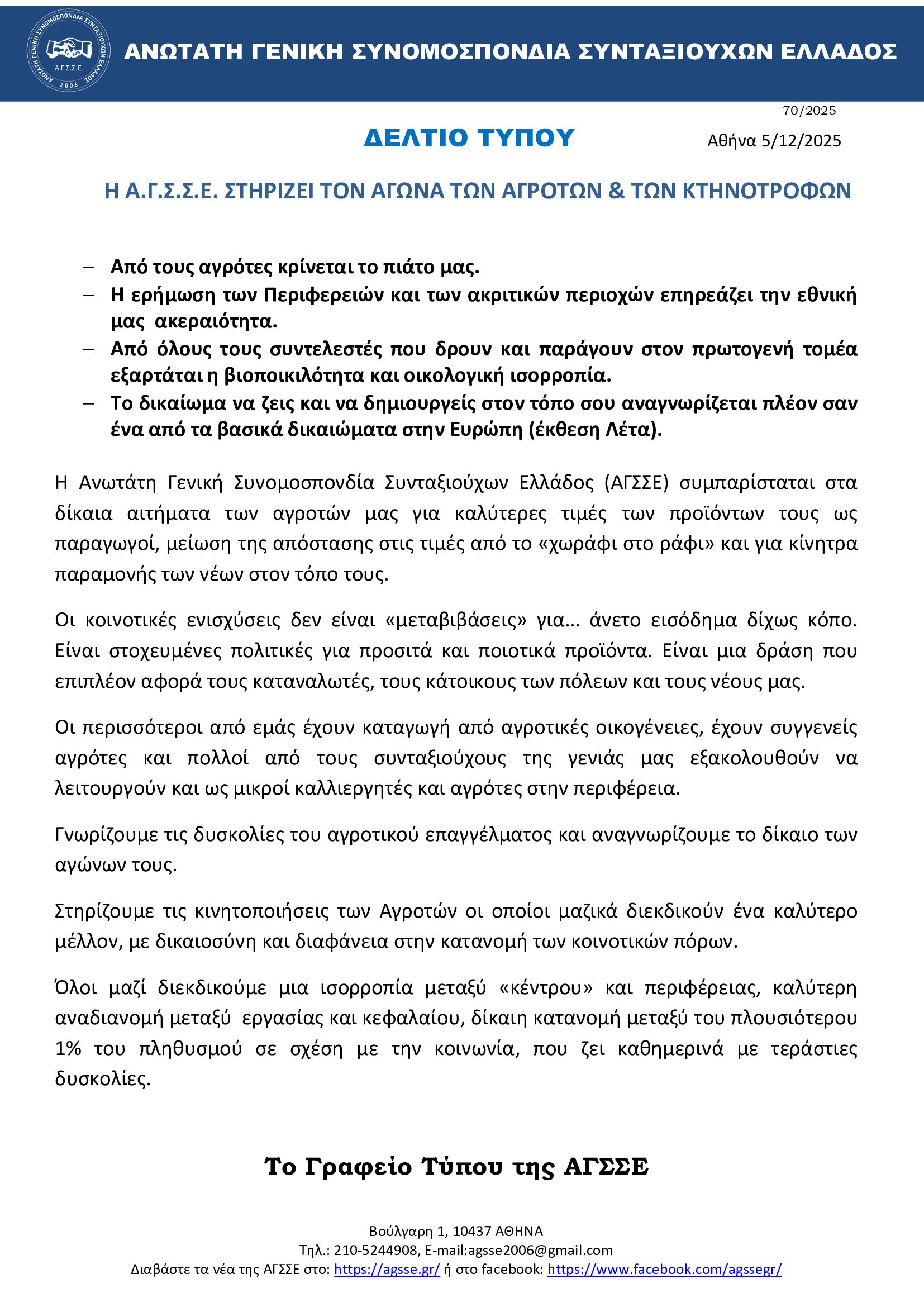 Ανακοινώσεις - ΝέαΔελτία τύπου Η Α.Γ.Σ.Σ.Ε. ΣΤΗΡΙΖΕΙ τον ΑΓΩΝΑ των ΑΓΡΟΤΩΝ & των ΚΤΗΝΟΤΡΟΦΩΝ 6 Δεκεμβρίου 2025