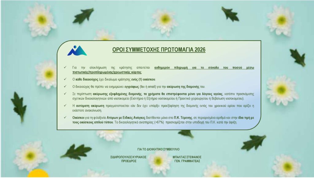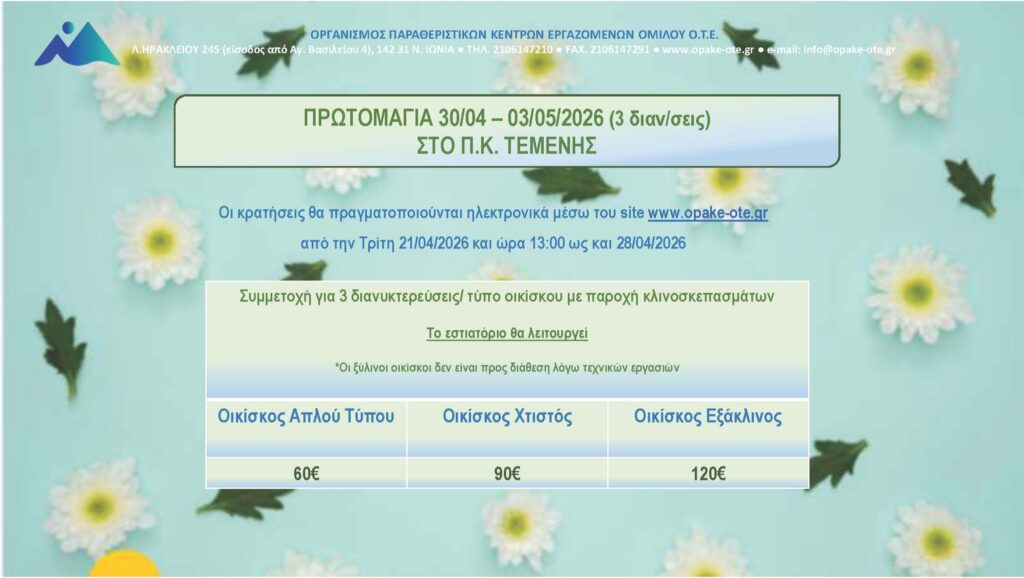 Σας κοινοποιούμε την ανακοίνωση του ΟΠΑΚΕ – ΟΤΕ για την ΠΡΩΤΟΜΑΓΙΑ 2026 στο παραθεριστικό κέντρο ΤΕΜΕΝΗΣ στο οποία μπορούν να φιλοξενηθούν και οι Συνταξιούχοι μέλη μας, με τις ίδιες προϋποθέσεις με τους εργαζόμενους ΟΤΕ.