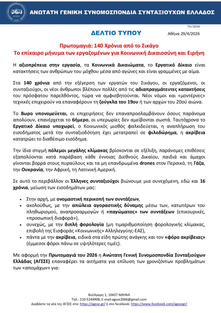 Η ΑΓΣΣΕ καλεί τους συνταξιούχους από κάθε γωνιά της πατρίδας μας να πάρουν μαζικά μέρος στις κατά τόπους εκδηλώσεις μνήμης για την Εργατική Πρωτομαγιά και τους αγώνες για ένα καλύτερο μέλλον για εμάς, τα παιδιά και τα εγγόνια μας!